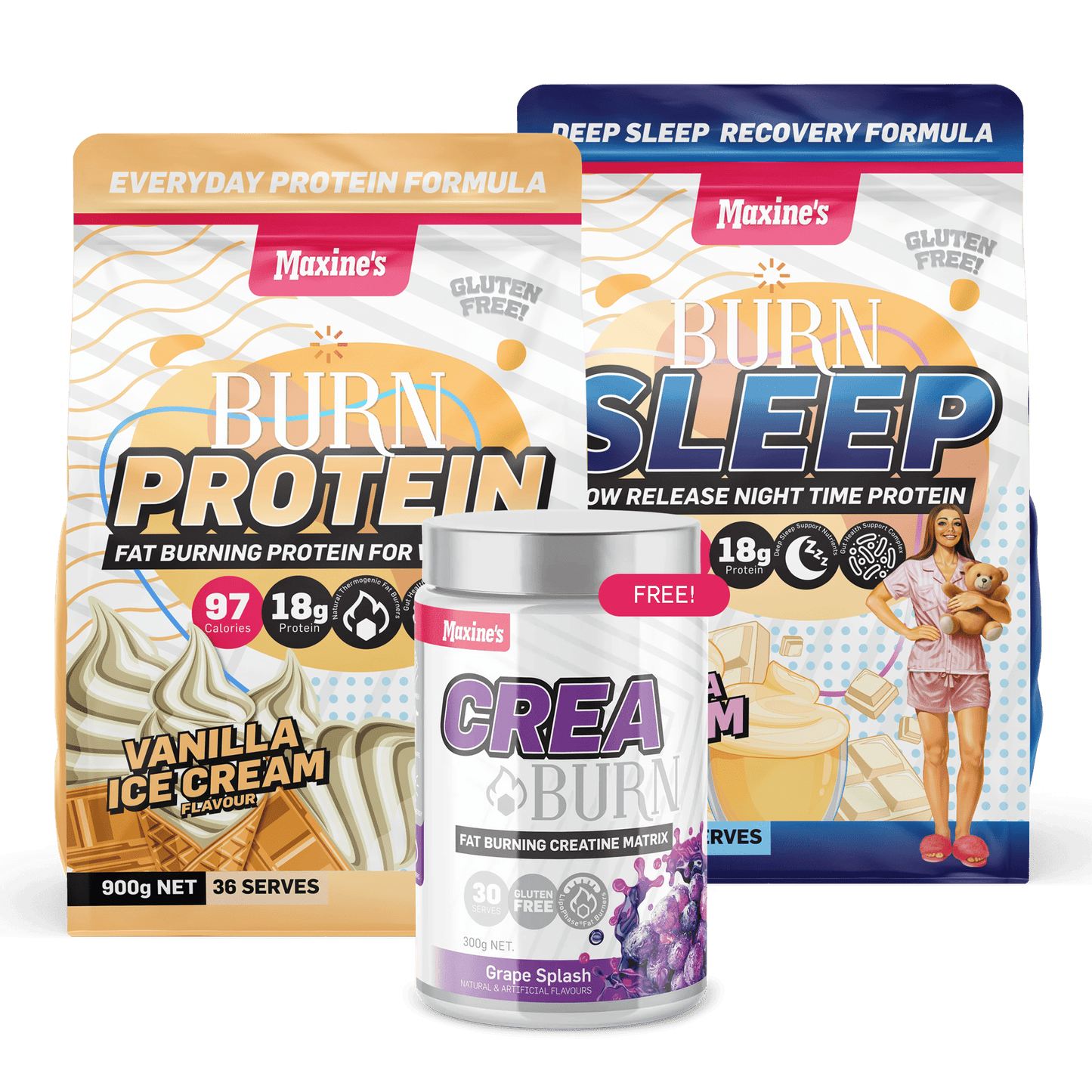 The Maxine's Burn Lean & Tone Bundle is packed with everything you need to build the body of your dreams! This bundle contains our everyday fat burning BURN PROTEIN formula along with our slow release, deep sleep enhancing BURN SLEEP formula to give you the day and night protein hit, with added fat burning ingredients, that will help you build the ultimate lean and toned body! Plus get a Free CREA BURN flavoured creatine formula.