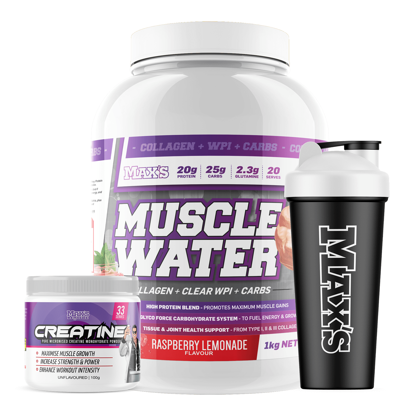 Meet MAX'S MUSCLE WATER. The clear, refreshing and fruity way to stack on muscle and support healthy joints, bones and gut health. This perfect combination of Clear WPI, Type I, II and III Collagen Peptides and our mass-building Glyco Force Carbohydrate System is your new refreshing way to stack on size, support your overall health and build quality muscle. Plus, we've thrown in a 33 serve Creatine Monohydrate and our premium shaker for free.