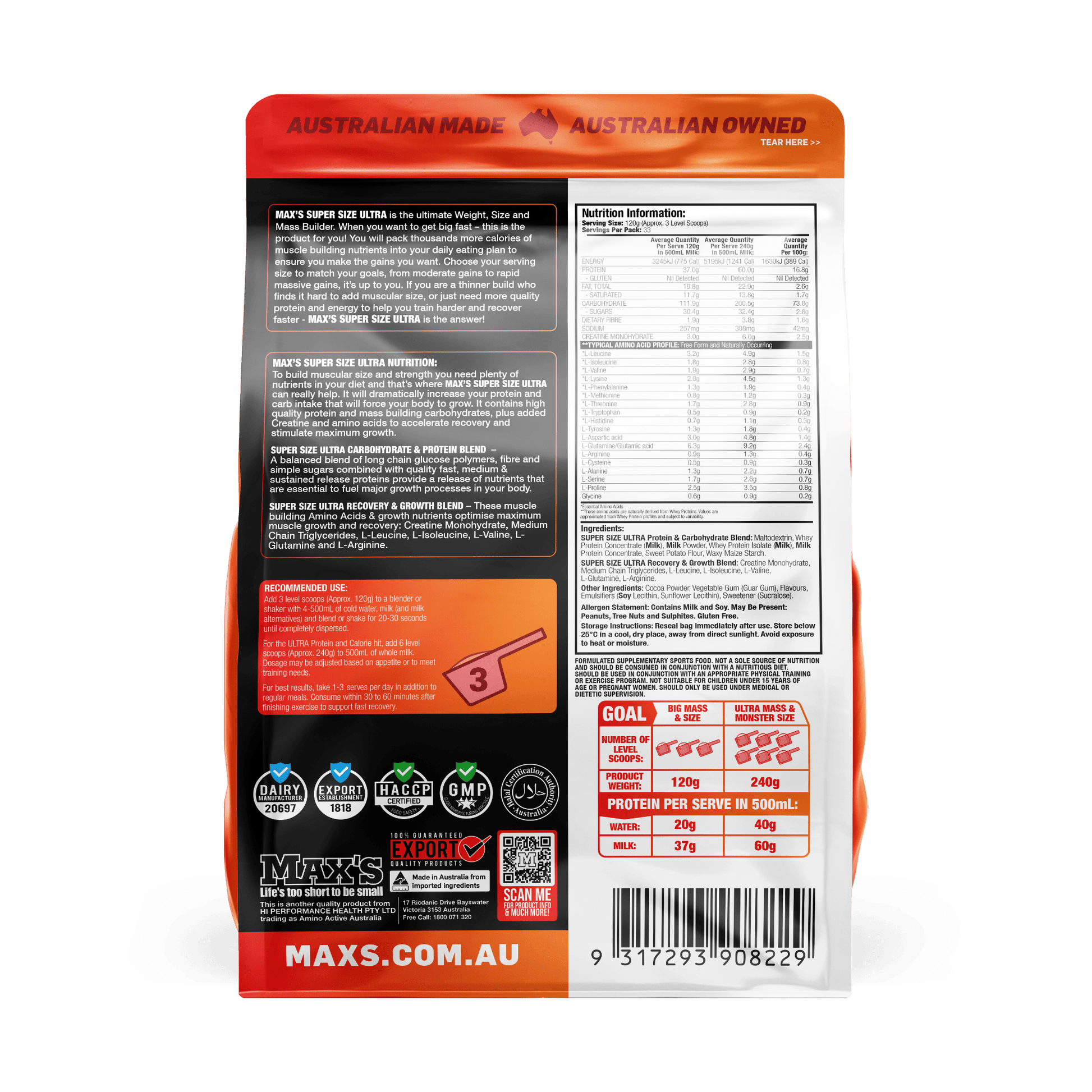 MAX'S Pro Series Supersize ULTRA combines all the nutrients you need to pack on size in one great formula. You get BIG protein, BIG carbs, amino acids and creatine all in the one delicious formula - ideal for athletes and trainers who are training hard and heavy to build maximum size, strength and power.